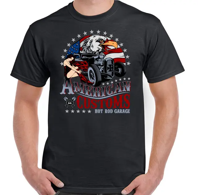 Americain Customs Hot Rod Garage T Shirt Hommes Drapeau Aigle Moteur