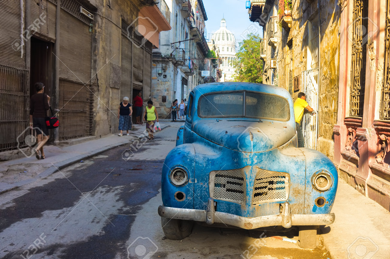 Scene De Rue Avec Une Vieille Voiture Americaine A La Havane Rouille